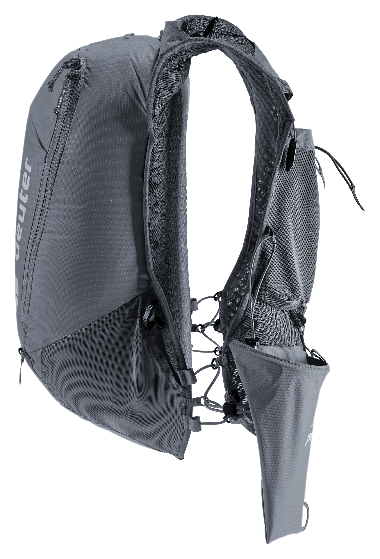 Leggero e confortevole: gli spallacci ergonomici a forma di gilet con cinghia di compressione elastica, le cinghie pettorali regolabili e il materiale morbido dello schienale permettono allo zaino di adattarsi alla parte superiore del corpo. Inoltre, la tasca interna in rete e le cinghie di compressione laterali riducono al minimo il movimento su e giù del carico durante la corsa. Il portapali a fondina sulla tracolla permette un accesso rapido ai pali. Fiaschetta morbida e GPS sono anche sempre a portata di mano nelle tasche sugli spallacci. Il materiale principale dello zaino Trailrunnig è 100% riciclato e certificato bluesign®.
