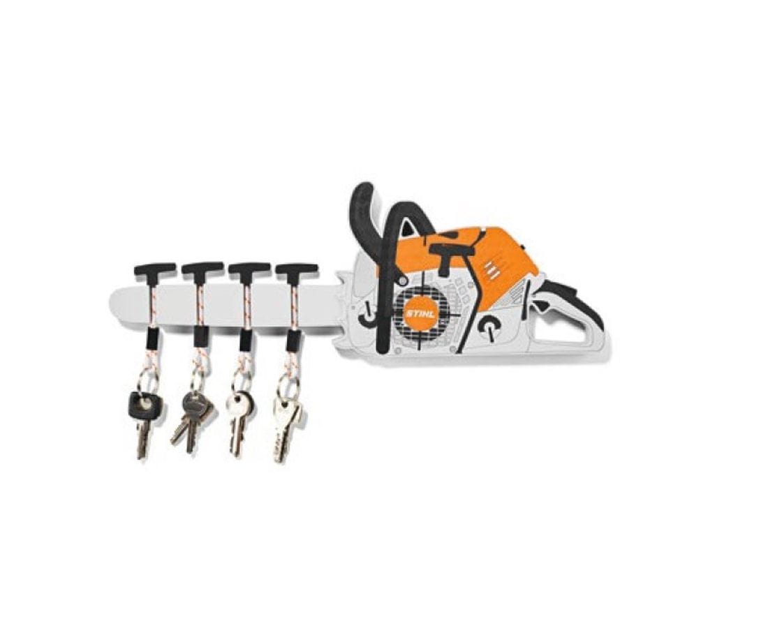 Non cercherete mai più le Vostre chiavi! Con questo pannello portachiavi STIHL a forma di motosega, tutti le chiavi saranno facili da trovare in futuro. Il pannello portachiavi è in legno ed è stata realizzato secondo lo stile dell’MS 500i. Un magnete integrato nel corpo assicura che chiavi e altri oggetti metallici leggeri possano essere posizionati in aggiunta e non cadano. Il pannello portachiavi comprende anche quattro anelli portachiavi che ricordano l’impugnatura di una motosega in metallo.